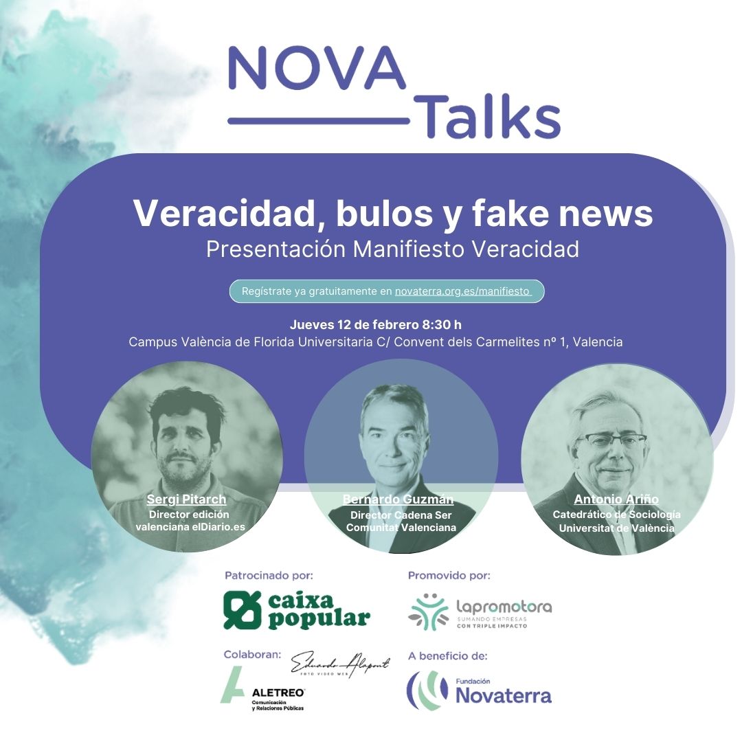 El jueves 12 de febrero de 2026 a las 8:30h vuelven los NOVA_Talks. En esta 16ª edición, el tema que se debatirá es el de «Veracidad, bulos y fake news». Además del ya tradicional coloquio y el coffee networking, en esta ocasión se presentará el Manifiesto de Veracidad que ya puedes leer y firmar en su página web https://manifiestoveracidad.org/