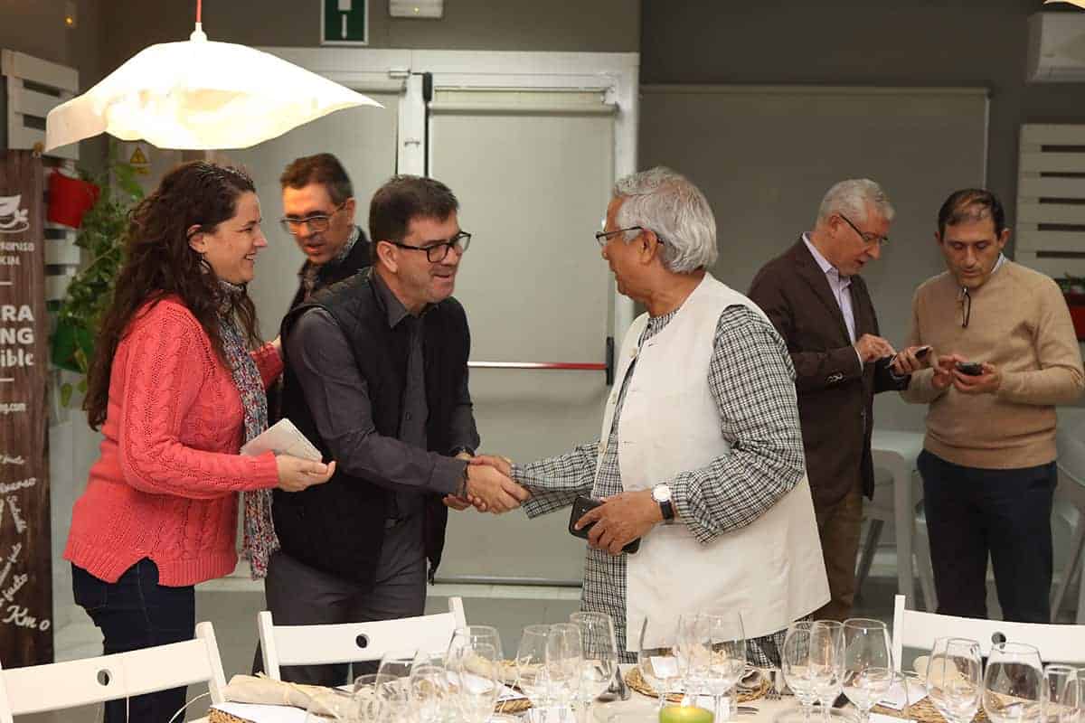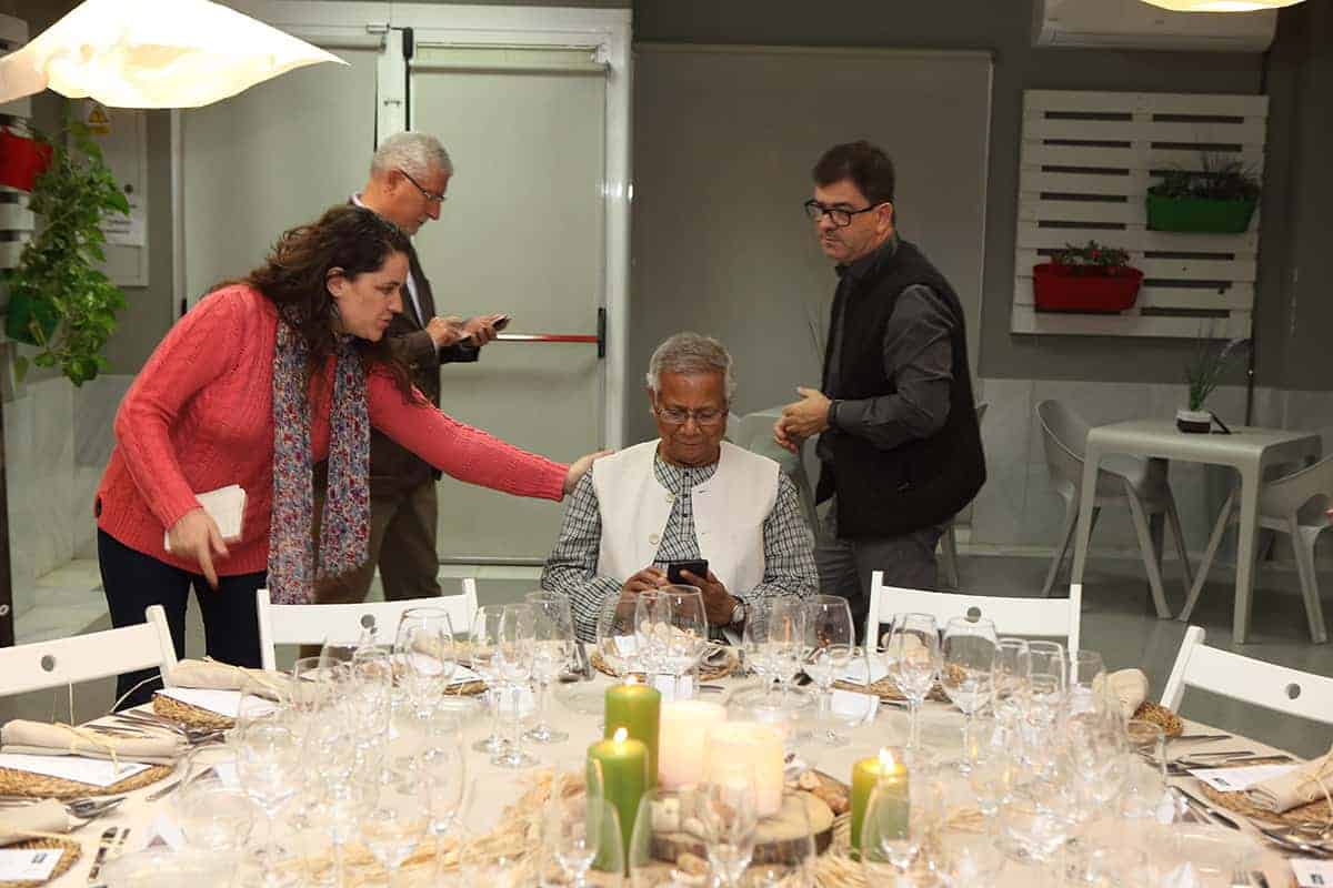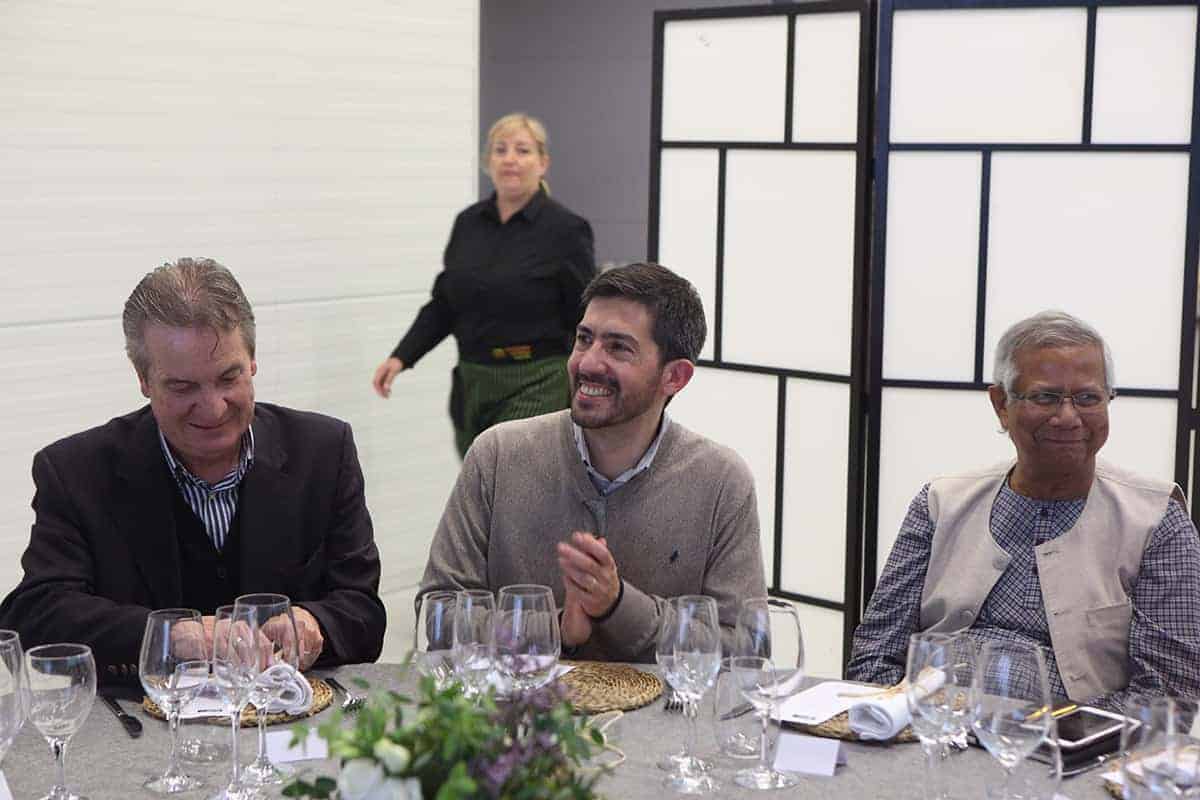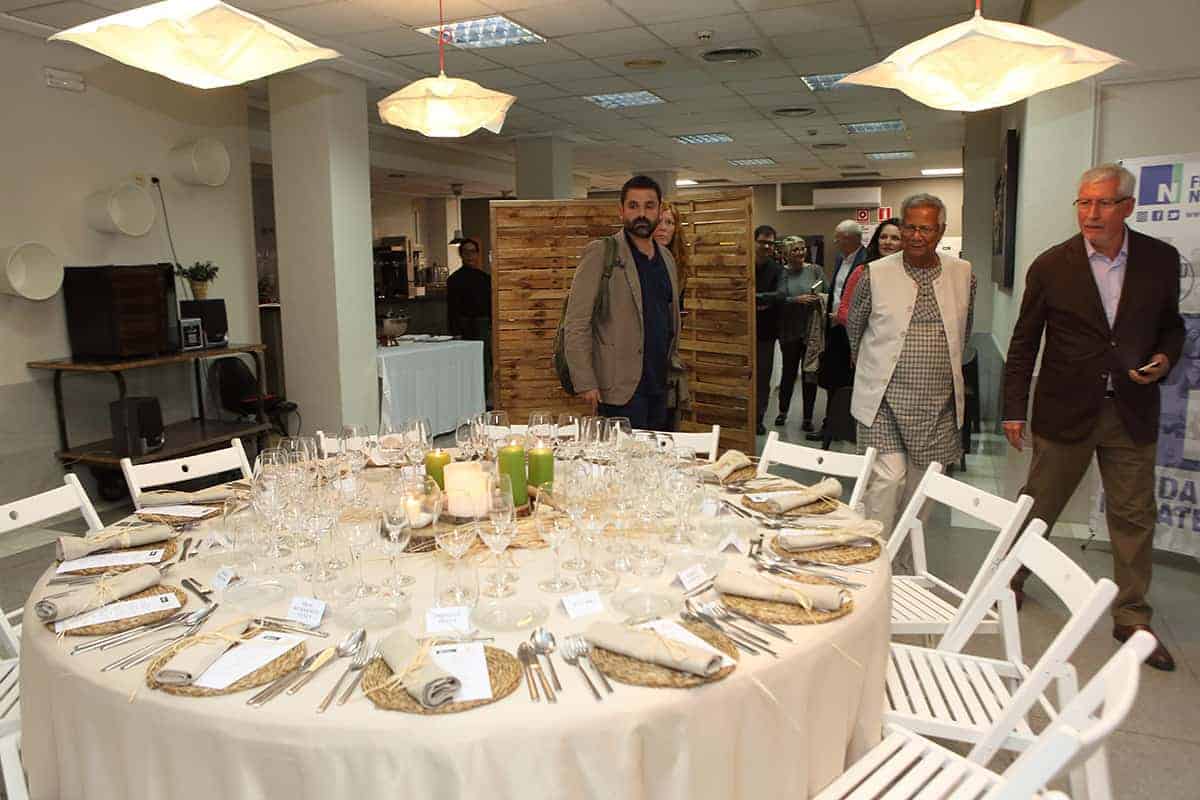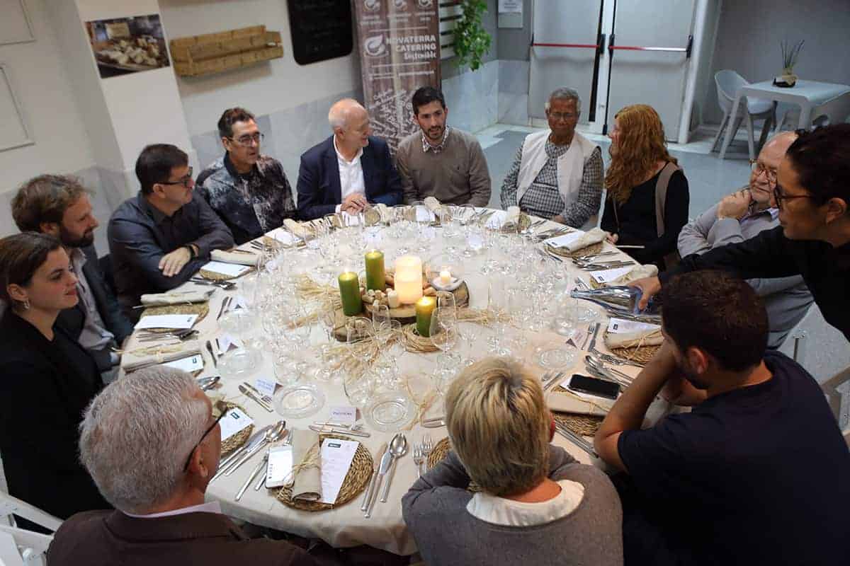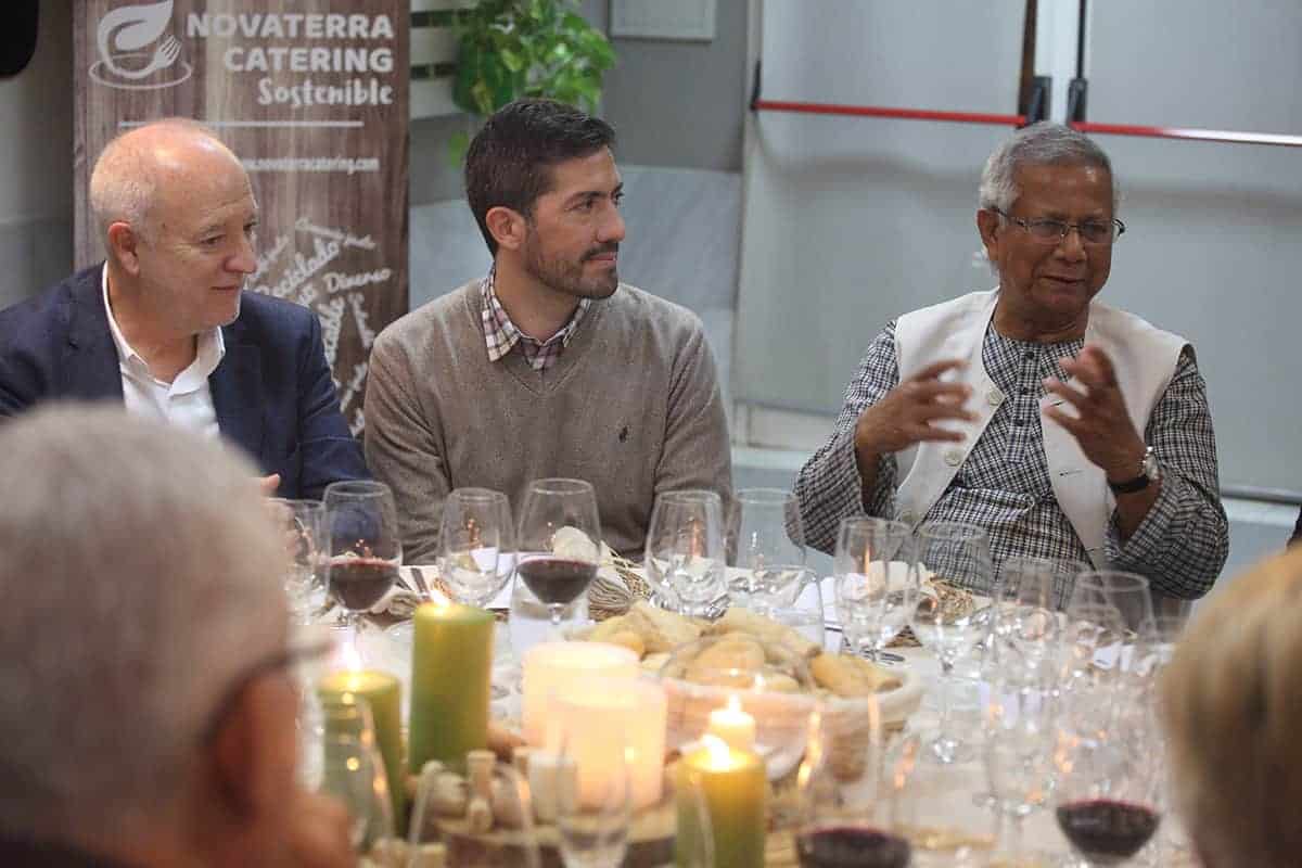 Tras las reuniones, tuvo lugar una cena servida por Novaterra Catering Sostenible, con la colaboración de Caixa Popular, en la que pudieron debatir con el profesor Yunus la Concejala de Economía del Ayuntamiento de Valencia, Sandra Gómez, Consol Castillo, Concejala de Bienestar Social del Ayuntamiento de Valencia, Ramón Cardona, Coordinador de FIARE Banca Ética en Valencia, Joan Mir, Director General de Aneccop, Enric Luján, Director de Florida Grup Universitari, Paco Pons, Vicepresidente de Novaterra y Emili Altur, Vicepresidente 3º de la Diputación de Valencia, junto a Jaume, Sergi y Andrea de Tandem Social, y Christian Mecca de Novaterra Catering.