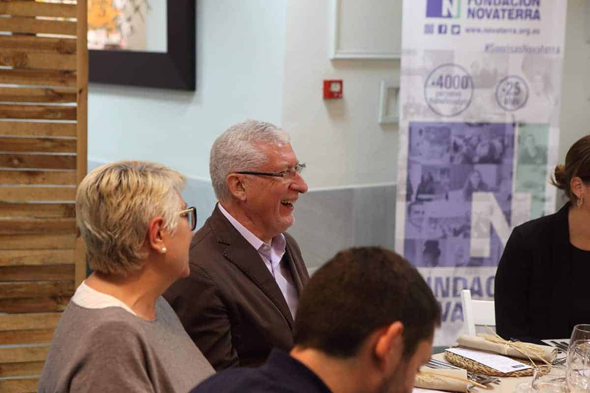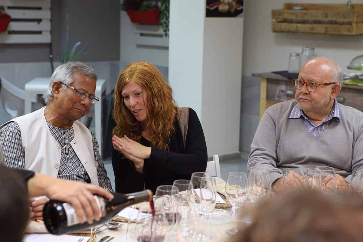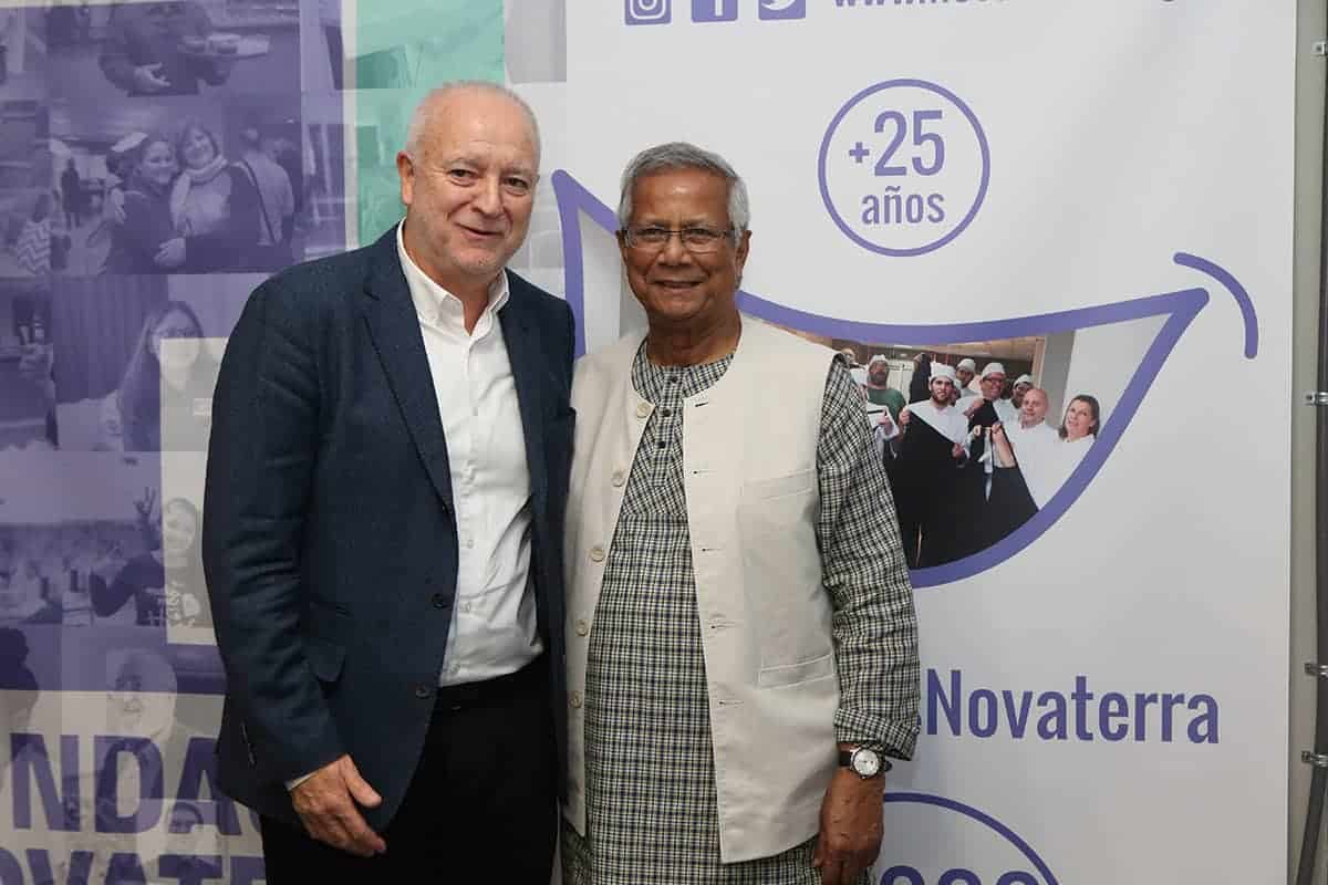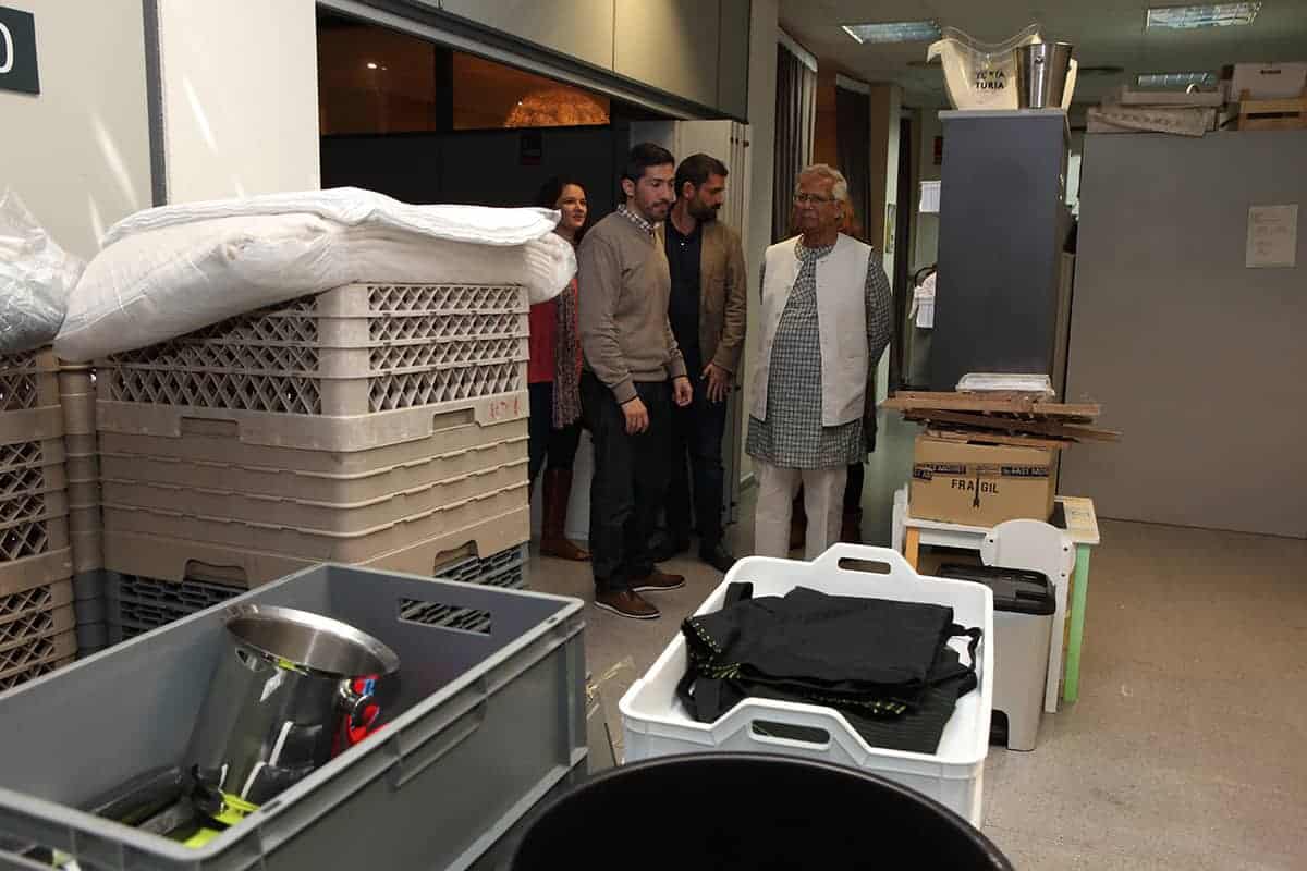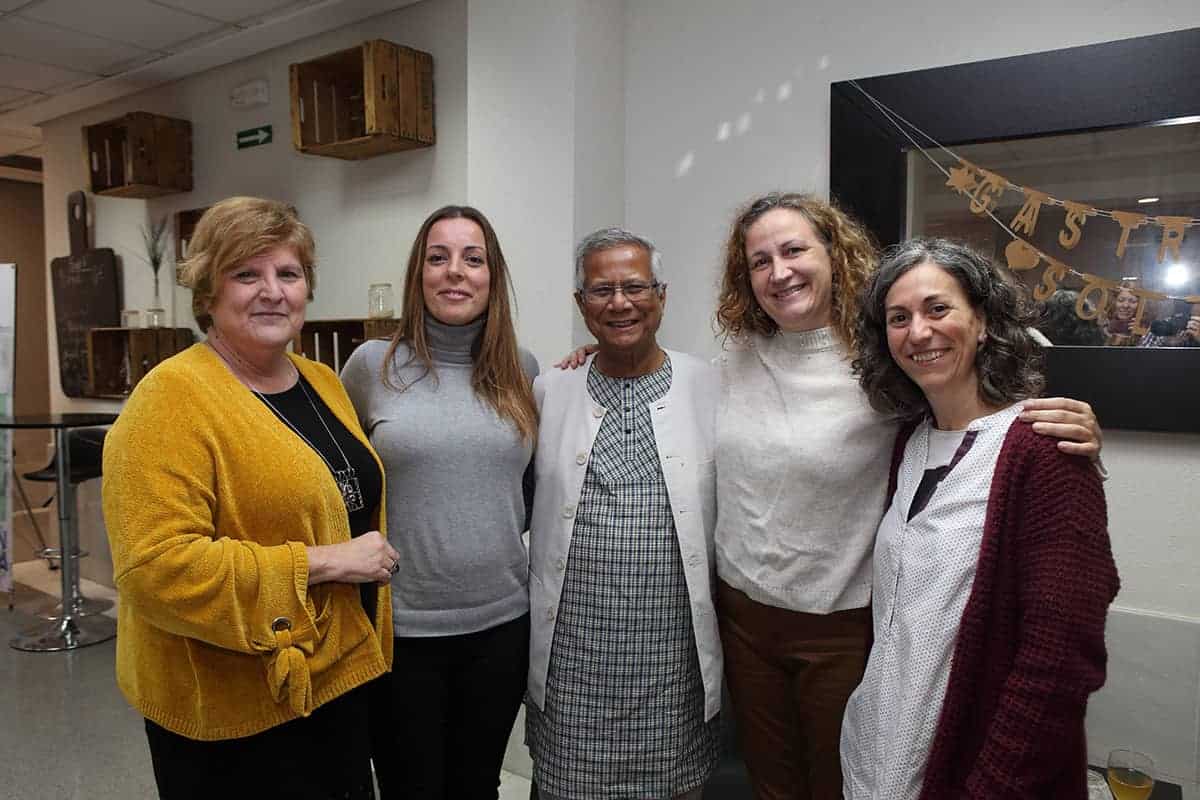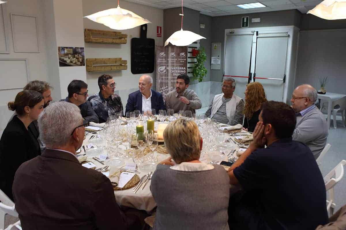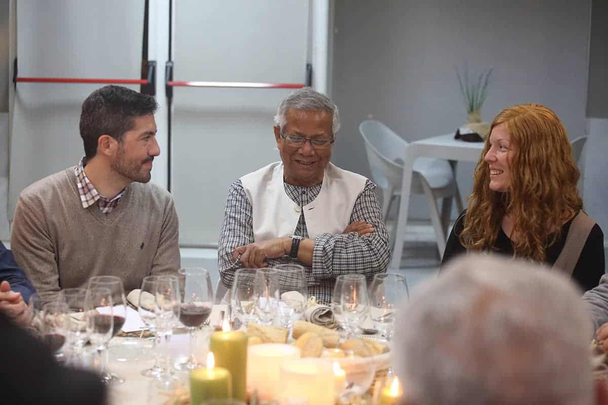 Tras las reuniones, tuvo lugar una cena servida por Novaterra Catering Sostenible, con la colaboración de Caixa Popular, en la que pudieron debatir con el profesor Yunus la Concejala de Economía del Ayuntamiento de Valencia, Sandra Gómez, Consol Castillo, Concejala de Bienestar Social del Ayuntamiento de Valencia, Ramón Cardona, Coordinador de FIARE Banca Ética en Valencia, Joan Mir, Director General de Aneccop, Enric Luján, Director de Florida Grup Universitari, Paco Pons, Vicepresidente de Novaterra y Emili Altur, Vicepresidente 3º de la Diputación de Valencia, junto a Jaume, Sergi y Andrea de Tandem Social, y Christian Mecca de Novaterra Catering.