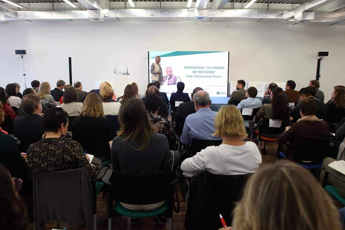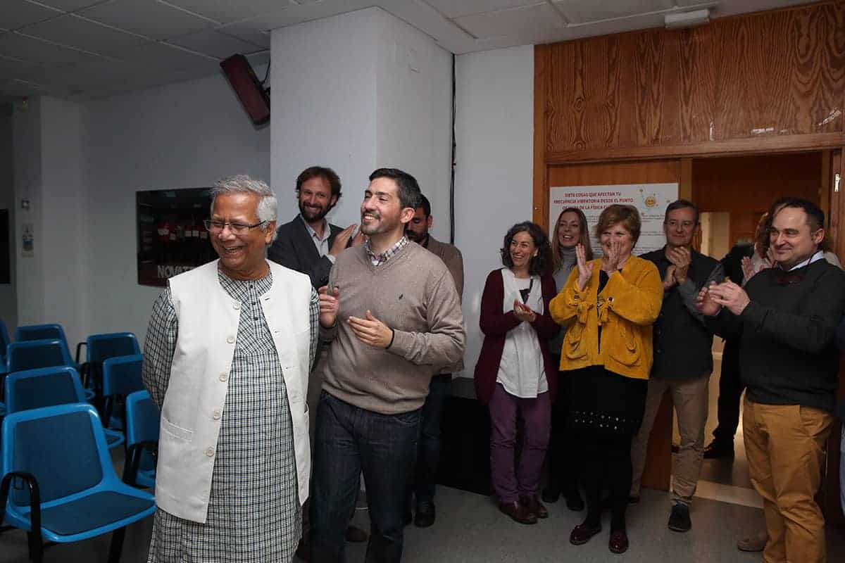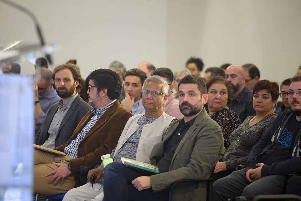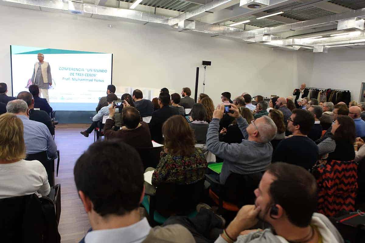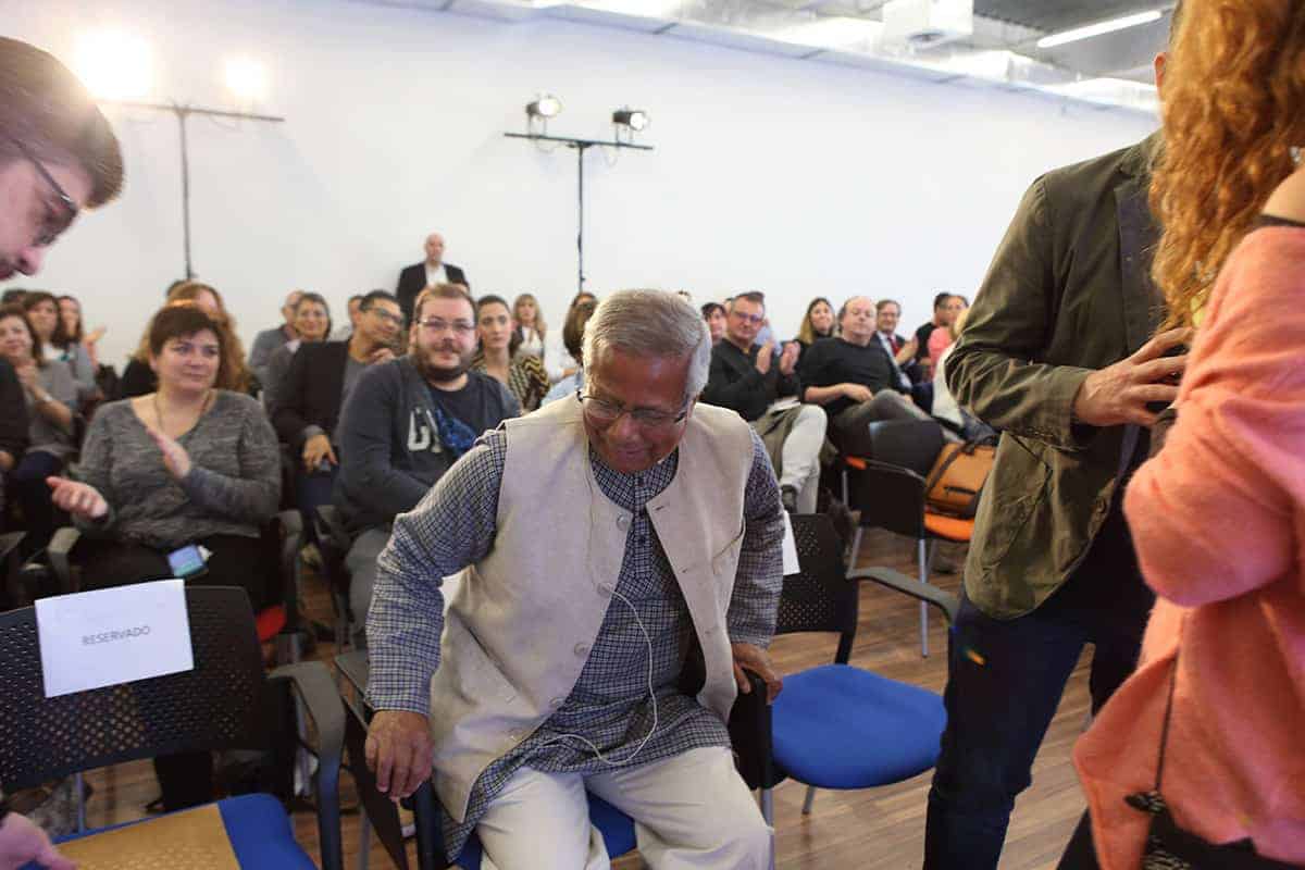 Era la primera vez en mi vida que a la entrada de un conferenciante en la sala veía levantarse y aplaudir a toda una sala de 200 personas que ansiaban escuchar al profesor y sus experiencias. Sin duda, no era para menos, y el discurso del profesor Yunus estuvo a la altura de la ovación, llenándonos de ideas, y de esperanza.