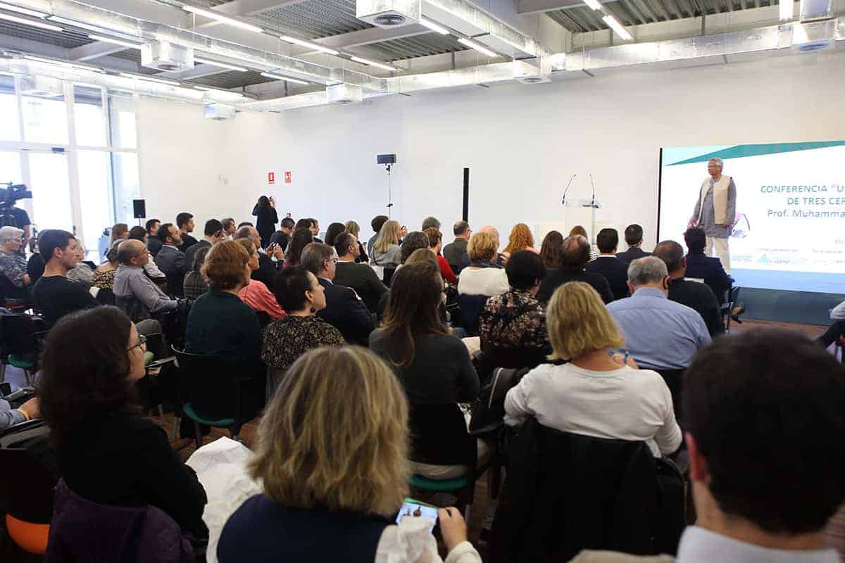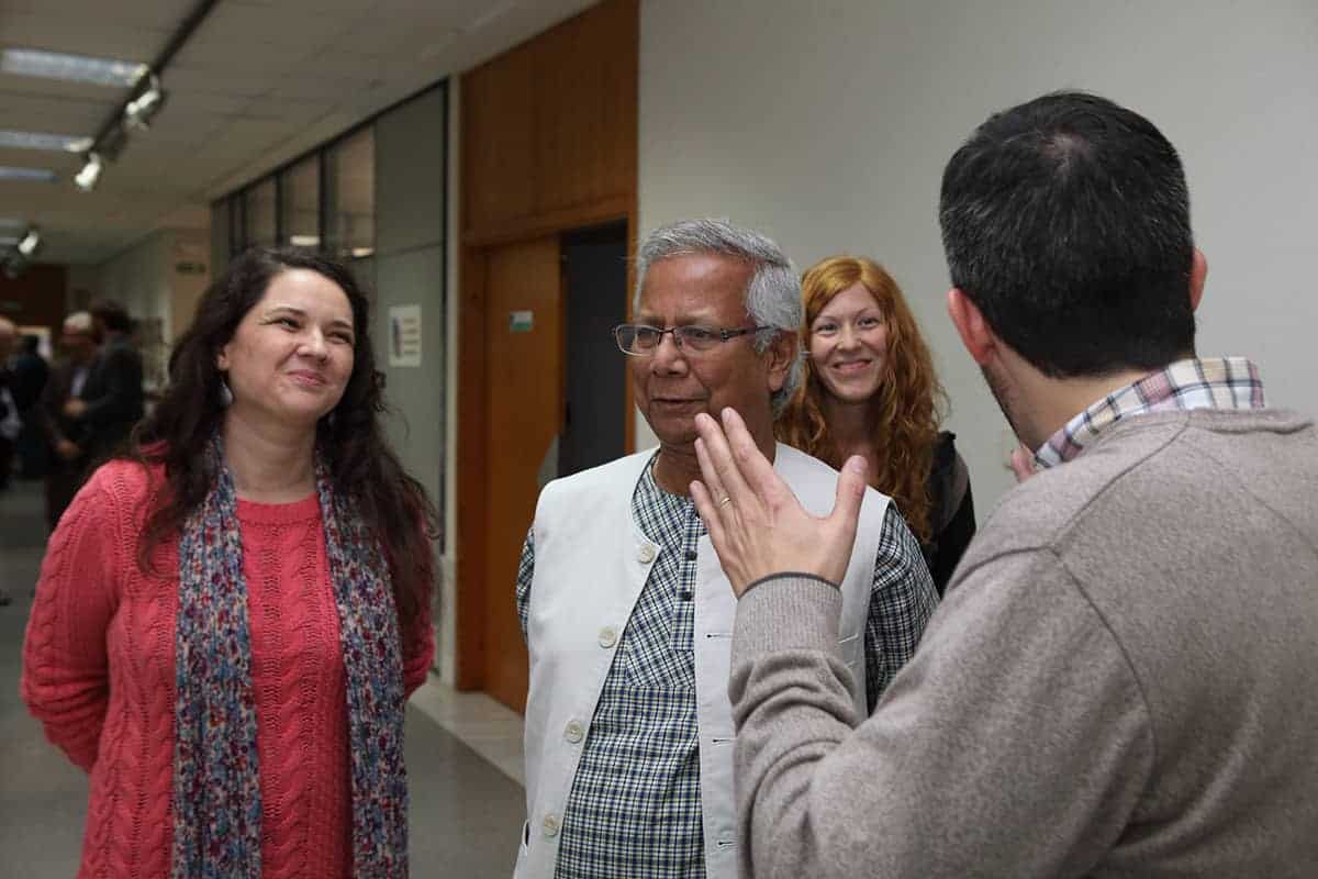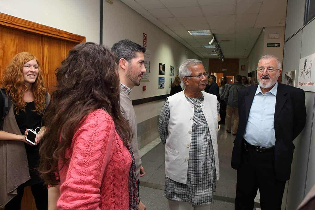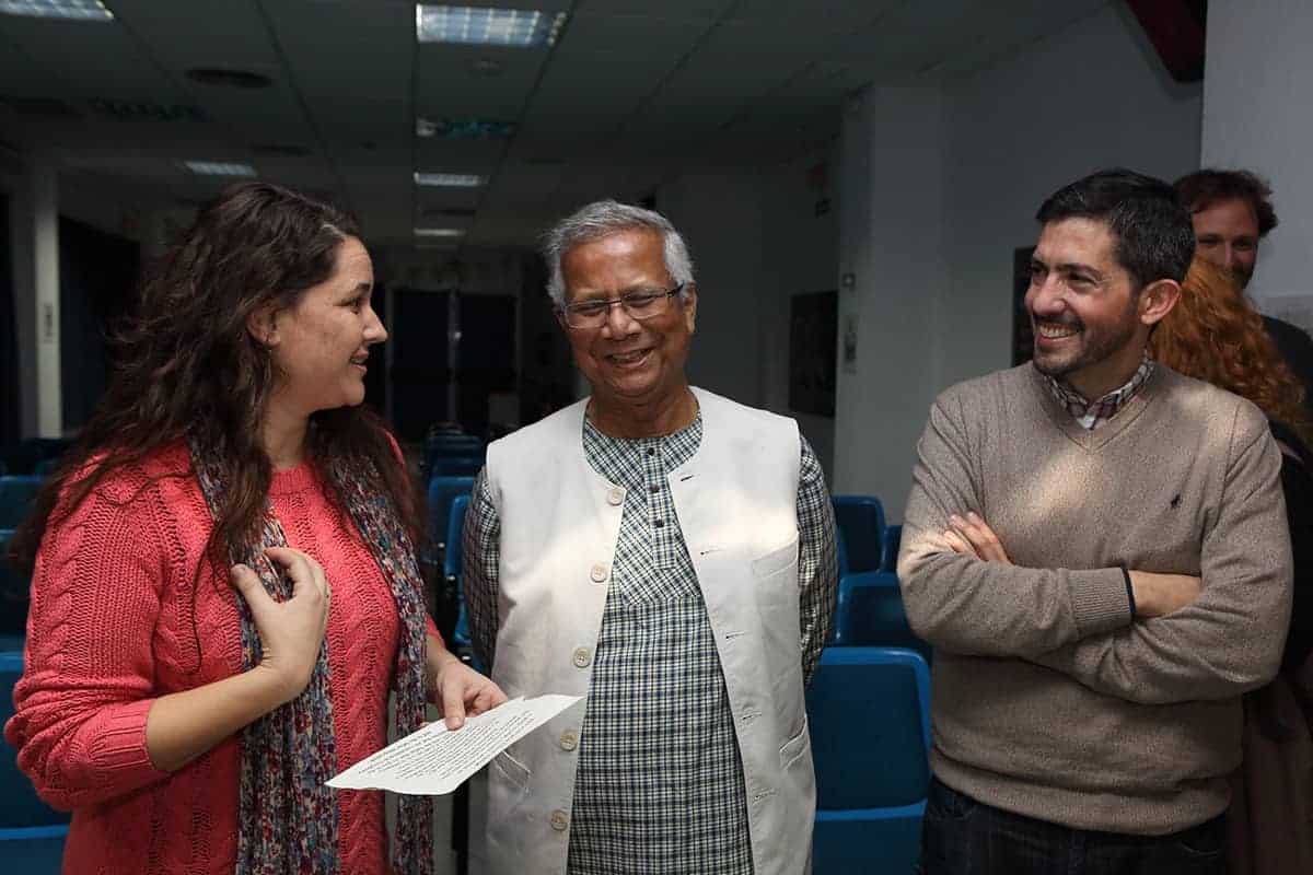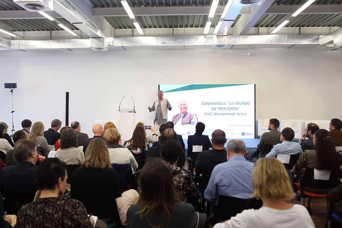 Era la primera vez en mi vida que a la entrada de un conferenciante en la sala veía levantarse y aplaudir a toda una sala de 200 personas que ansiaban escuchar al profesor y sus experiencias. Sin duda, no era para menos, y el discurso del profesor Yunus estuvo a la altura de la ovación, llenándonos de ideas, y de esperanza.