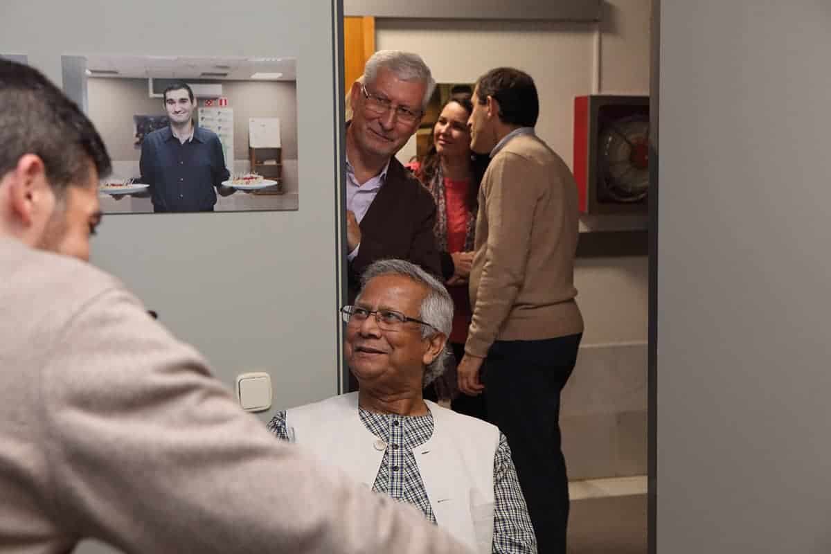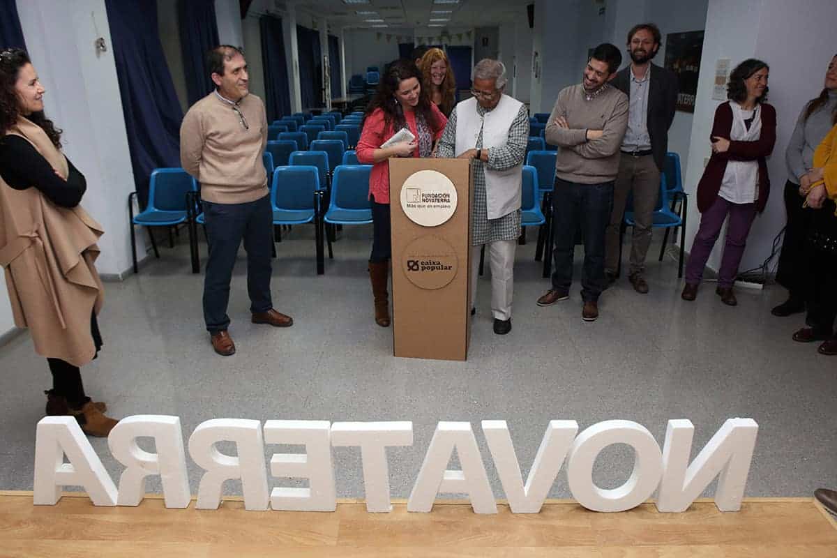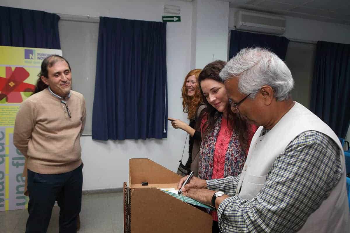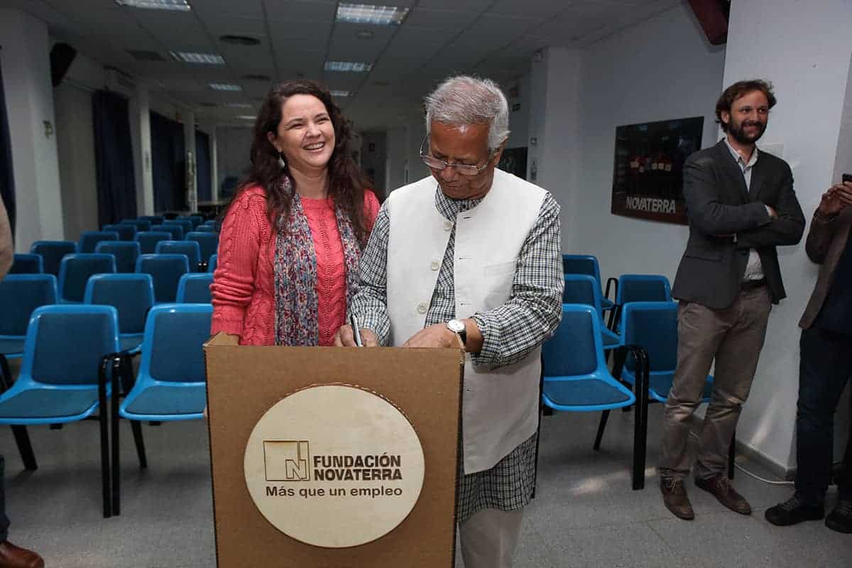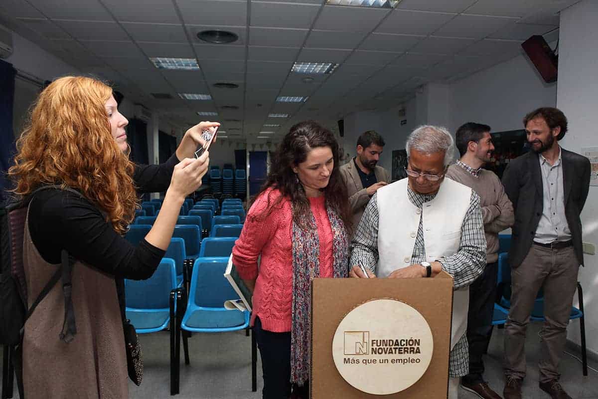 El profesor Yunus tuvo la amabilidad de inaugurar nuestro nuevo «Refugio Yunus». Una sorpresa que teníamos preparada para el equipo Novaterra. Un espacio para relajarse, para cuidarnos, pero también para soñar, para crear, para innovar en el ámbito de las empresas sociales, para encontrarnos. Nos dedicó un libro para que esté siempre en el refugio, y podamos releerlo para inspirarnos a seguir trabajando por las empresas sociales.