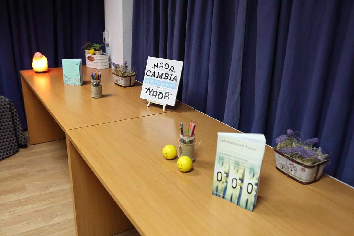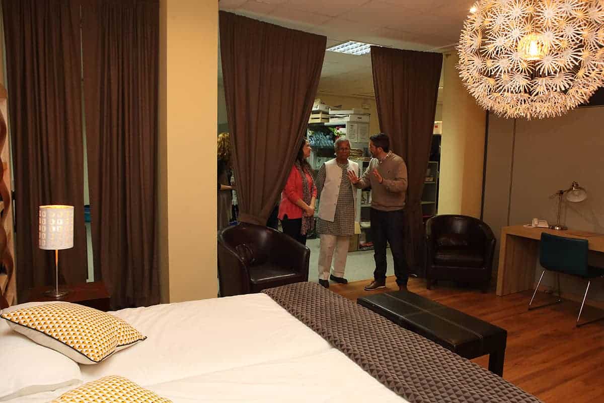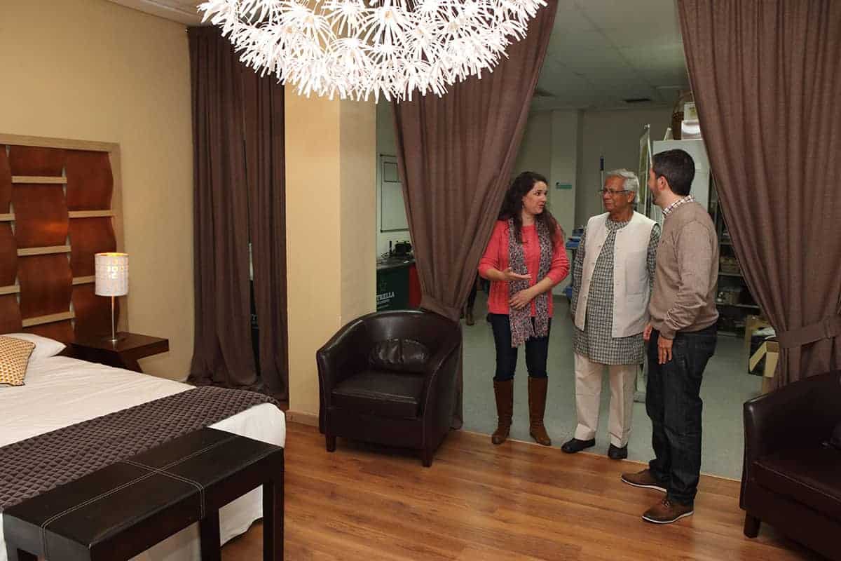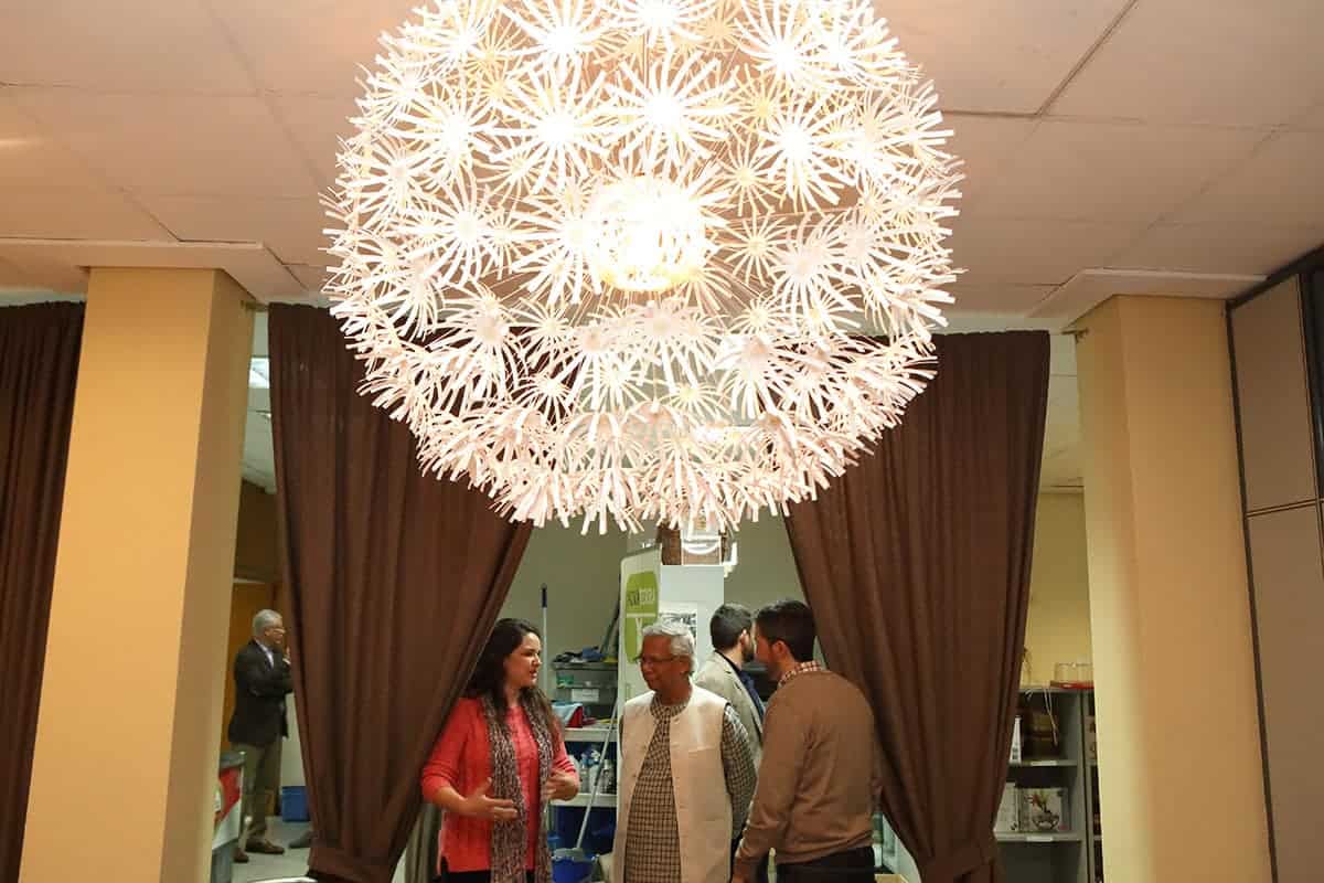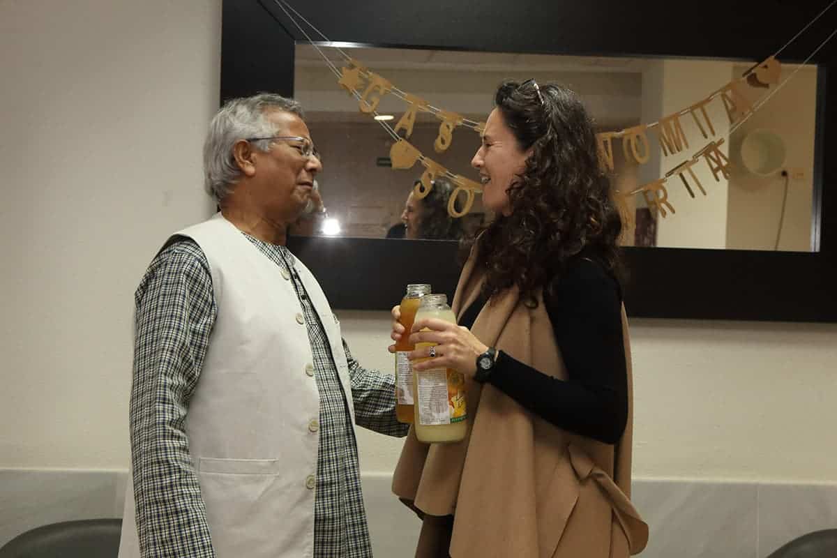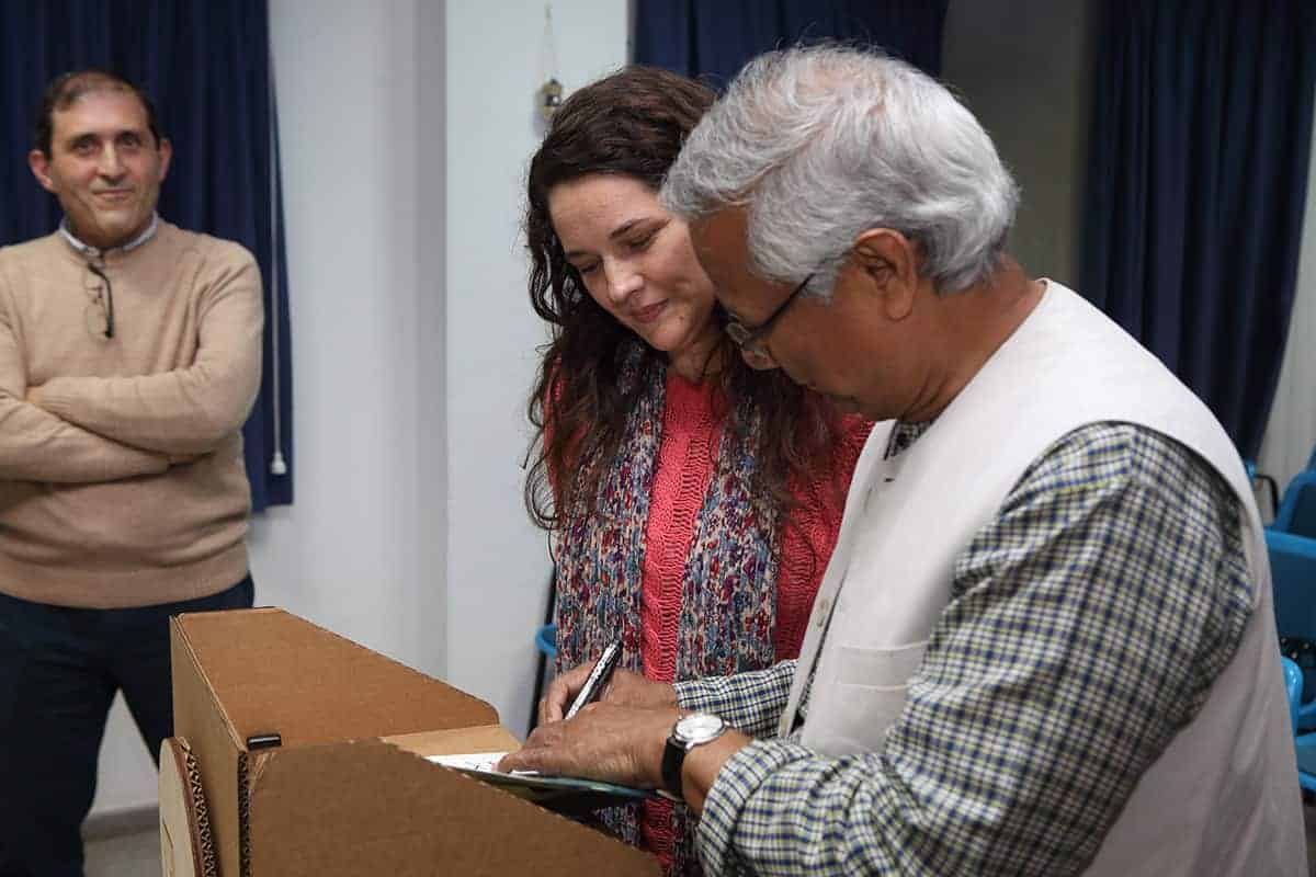El profesor Yunus tuvo la amabilidad de inaugurar nuestro nuevo «Refugio Yunus». Una sorpresa que teníamos preparada para el equipo Novaterra. Un espacio para relajarse, para cuidarnos, pero también para soñar, para crear, para innovar en el ámbito de las empresas sociales, para encontrarnos. Nos dedicó un libro para que esté siempre en el refugio, y podamos releerlo para inspirarnos a seguir trabajando por las empresas sociales.
