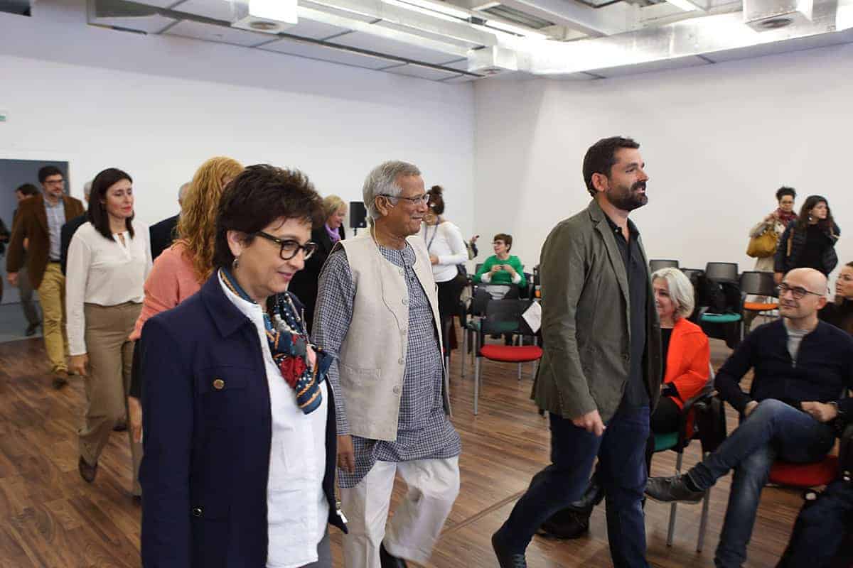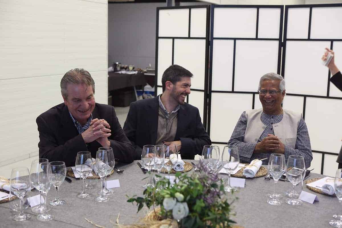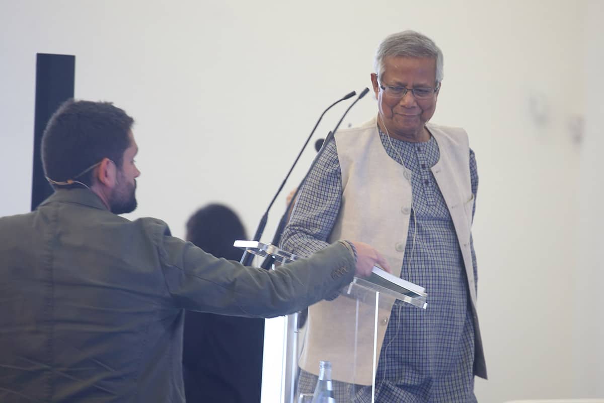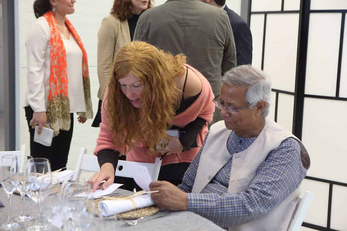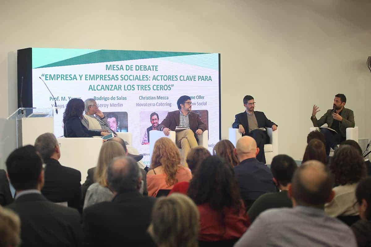 Tras la conferencia el profesor Yunus participó en una mesa redonda junto a representantes de Leroy Merlin, Tandem Social y Novaterra Catering Sostenible sobre la importancia del trabajo conjunto de empresas y empresas sociales.